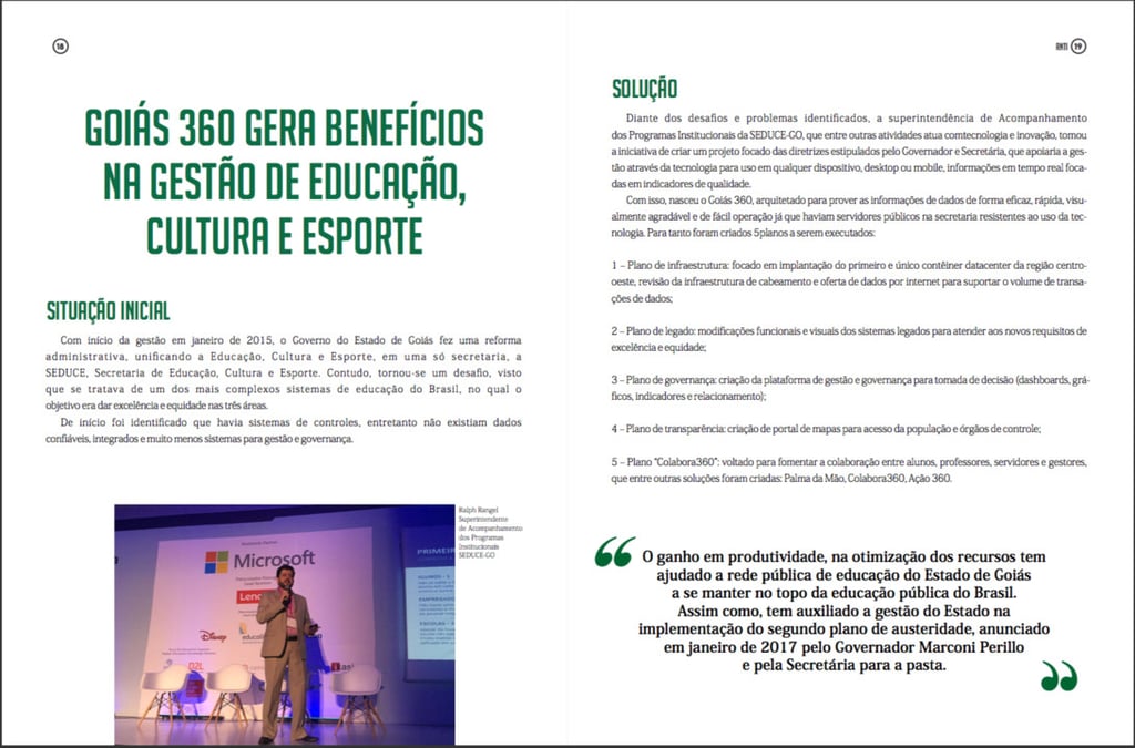 ‘‘O ganho em produtividade, na otimização dos recursos tem ajudado a rede pública de educação do Estado de Goiás a se manter no topo da educação pública do Brasil. Assim como, tem auxiliado a gestão do Estado na implementação do segundo plano de austeridade, anunciado em janeiro de 2017 pelo Governador Marconi Perillo e pela Secretária para a pasta. "